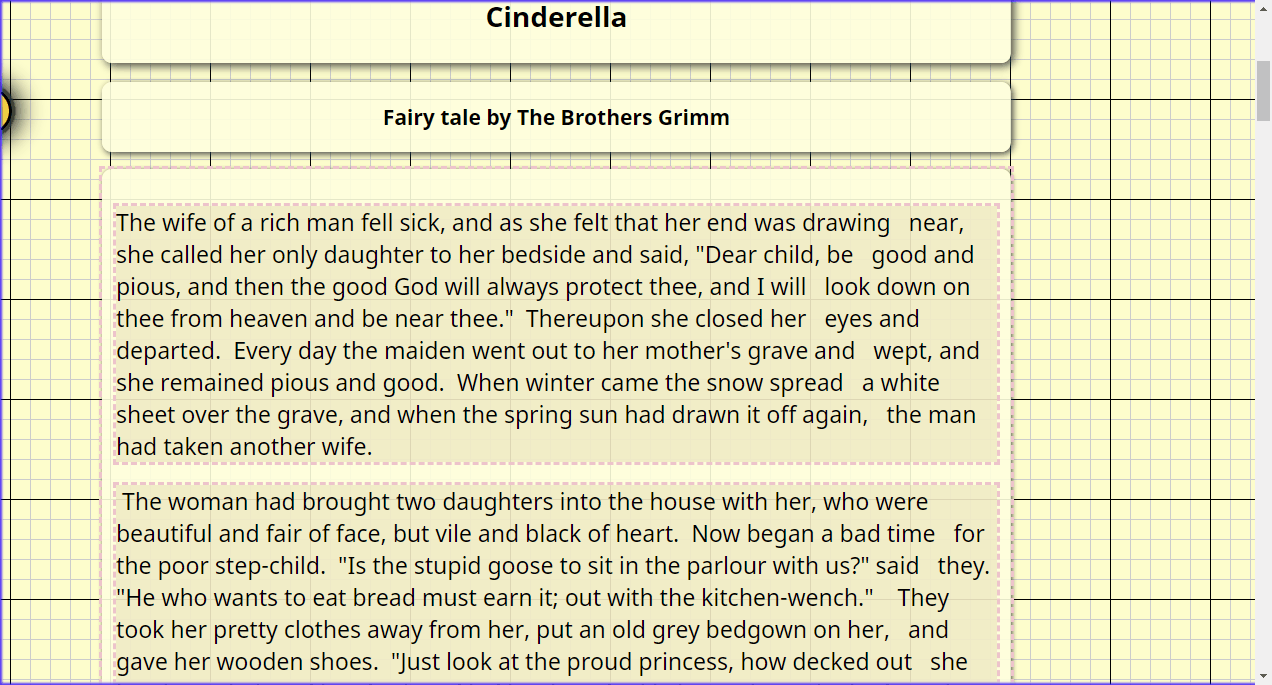 "Shiver and quiver, my little tree,And now the bird threw down to her a dress which was more splendid and magnificent than any she had yet had, and the slippers were golden. And when she went to the festival in the dress, no one knew how to speak for astonishment. The King's son danced with her only, and if any one invited her to dance, he said, "She is my partner."