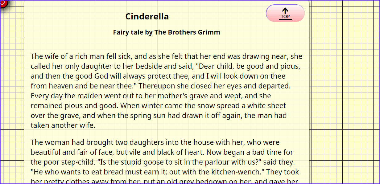 Once upon a time there was a dear little girl who was loved by every one who looked at her, but most of all by her grandmother, and there was nothing that she would not have given to the child. Once she gave her a little cap of red velvet, which suited her so well that she would never wear anything else. So she was always called little red-cap.